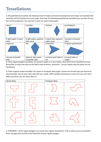 Printable primary math worksheet for math grades 1 to 6 ... printable grade 4 math worksheet Our math worksheets are made for math students in ESL or native speaking math classrooms and tutoring purposes. We use them in our own math classes and are convinced that our pdf worksheets could also be used in an online math education or math homeschooling. How to create a tessellation using the tracing paper ... Start with a square or rectangle. Add a curvy line to one side. Copy this line (using tracing paper) to the opposite side. Repeat for the other 2 sides. Use your imagination to decide what your shape looks like (a bird, a teddy bear, a rose?) Tessellate your pattern and decorate it.